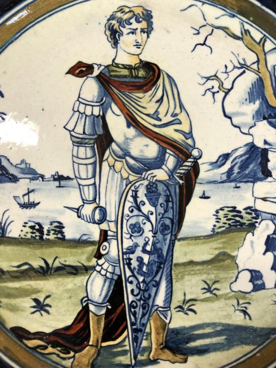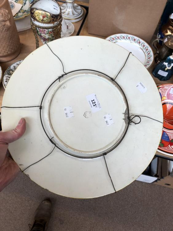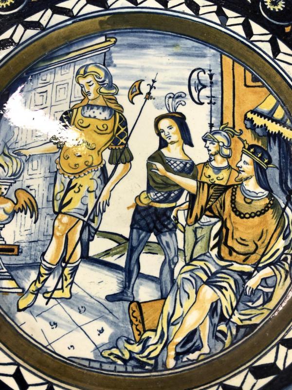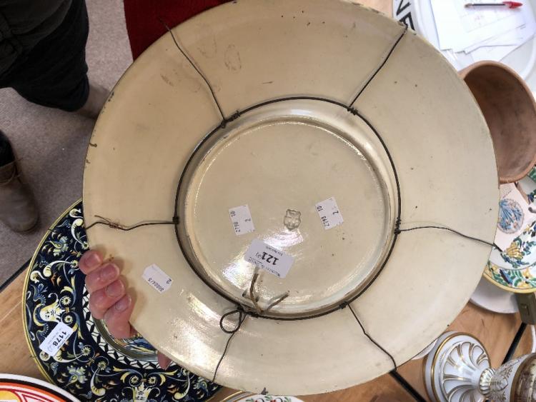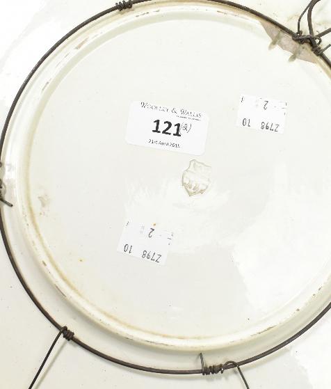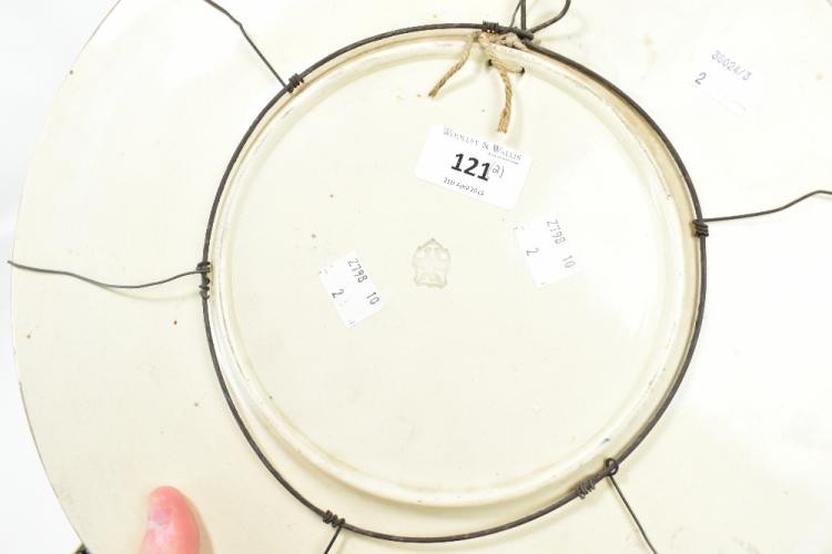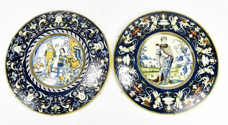 Lot 1178 of 2698: Two late 19th/early 20th century Continental maiolica chargers, with painted figural detail to recessed centres, the borders featuring grotesques and floral sprays on blue grounds, both with impressed marks featuring eagle and two turrets within shield to reverse, diameter of each 33cm (2).