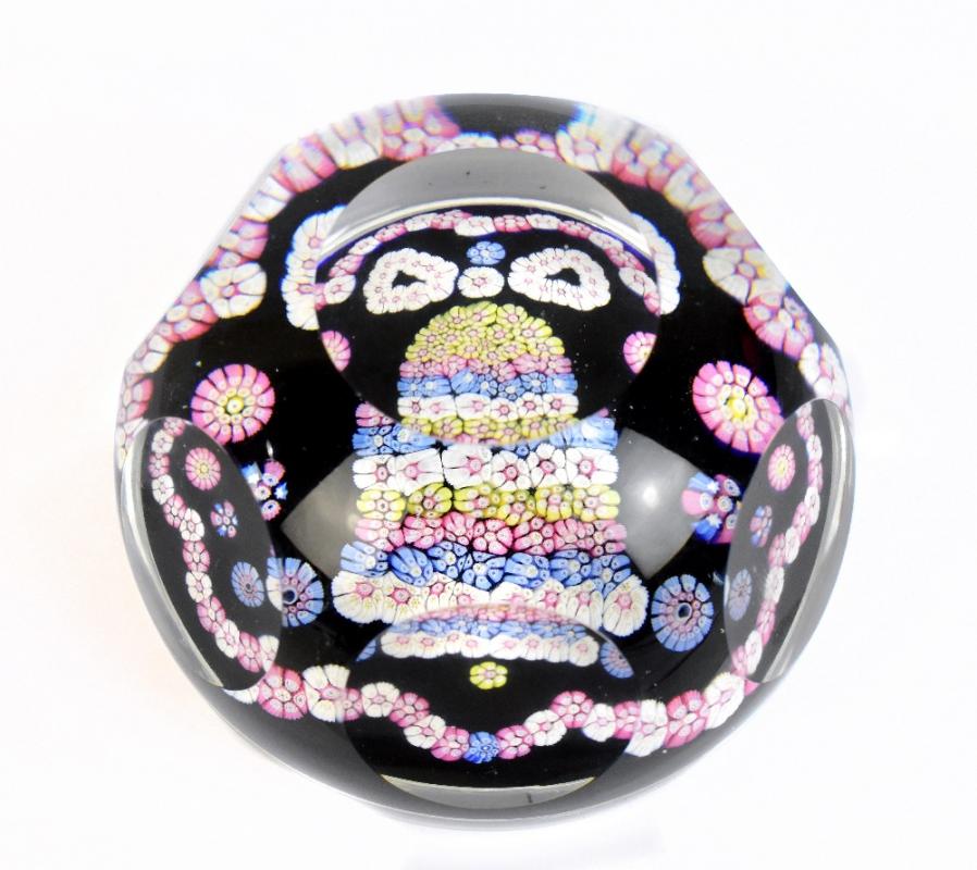 Lot 1244 of 2698: WHITEFRIARS; a faceted glass 'Bell' paperweight, signed with Monk to cane and dated 1980, diameter 8cm.