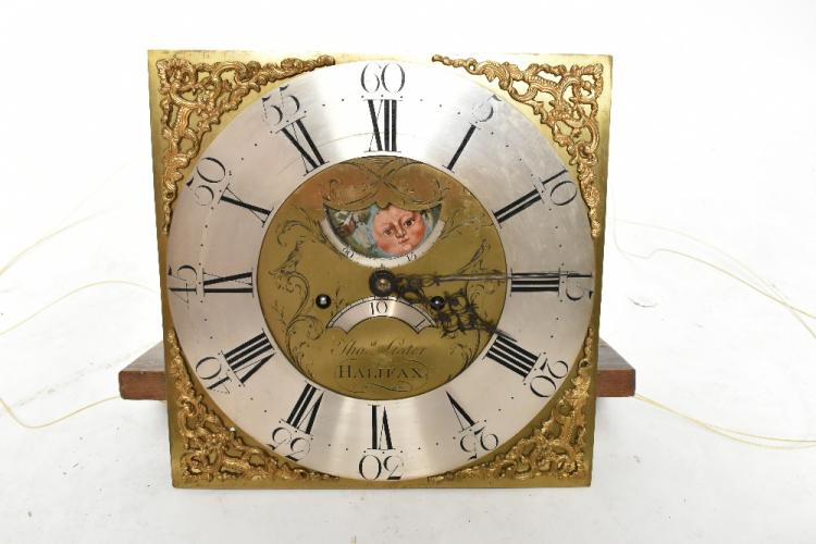 Lot 2507 of 2698: THOMAS LISTER JNR OF HALIFAX; an oak cased eight day longcase clock, the hood cornice and case of clock with blind fret decoration, the brass face with silvered dial and moon phase, height 222cm.