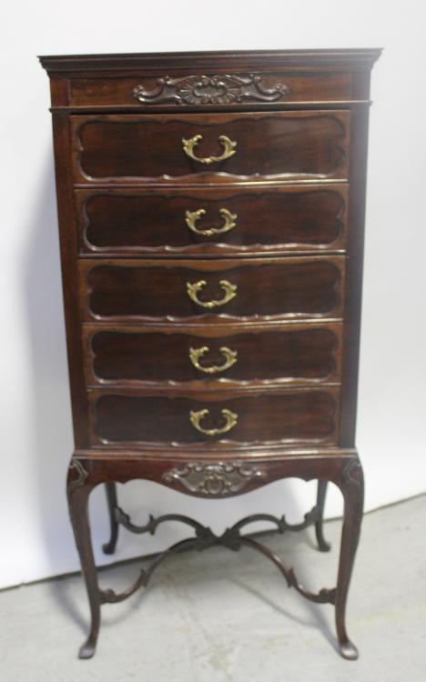 Lot 43 of 796: An Edwardian mahogany five-drawer music cabinet, carved frieze to base, to cabriole supports and cross-stretcher, 110 x 53cm.