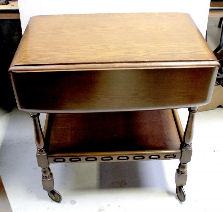 Lot 93 of 796: Two mid-20th century brass coal bins, one with relief of shipping scene, the other of a rural scene and a third example with a mirrored front inset with a hunting scene, a contemporary coffee table with elephant supports, length 90cm, a mid-20th century oak sewing table with lift-up top, single drawer to splayed tapering supports, height 48cm and an Ercol Colonial-style extending tea trolley on turned supports to casters, length when extended 80cm (6).