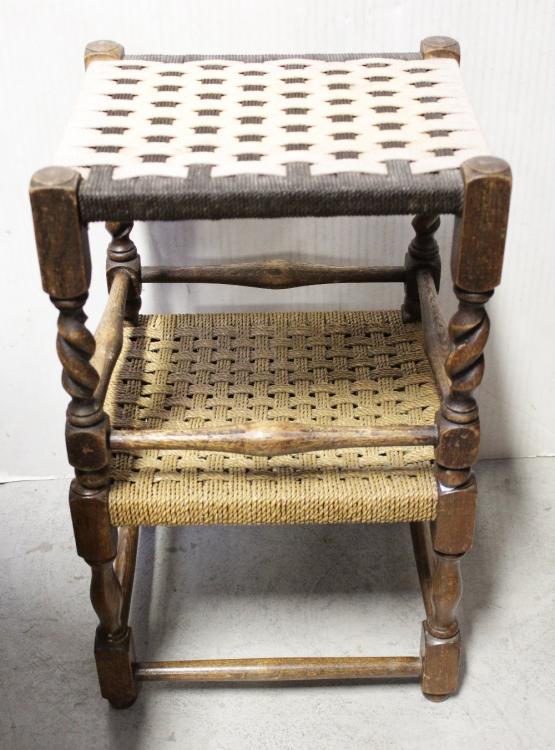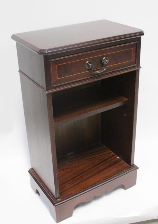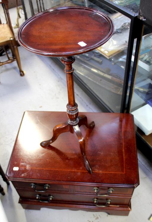 Lot 61 of 787: A reproduction mahogany bureau, a reproduction open-fronted cabinet, two woven-topped foot stools, magazine rack, dropleaf table, wine table and TV cabinet (8).