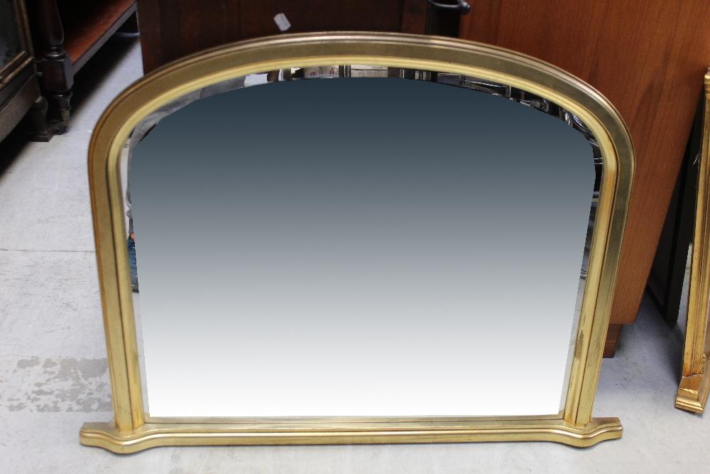 Lot 84 of 787: Three modern gold painted mirrors to include two dome-top overmantel mirrors, 120 x 78cm and 104 x 74cm respectively and a pierced pine square wall mirror, height 62cm (3).