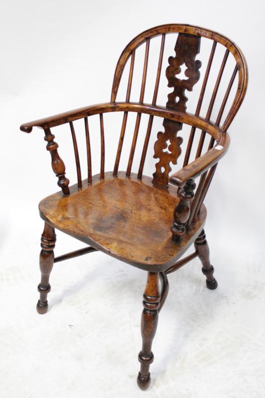 Lot 90 of 787: An 18th century elm-seated low-back Windsor armchair with yew wood back, raised on crinoline stretcher.