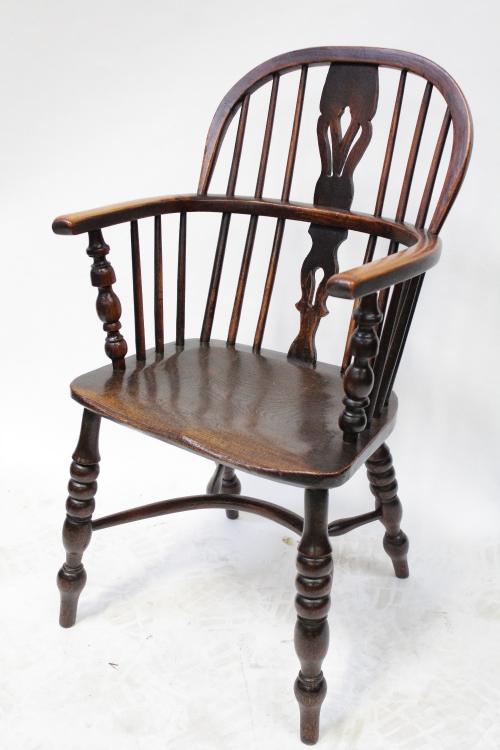 Lot 93 of 787: An 18th century elm-seated low-back Windsor armchair with crinoline stretcher.