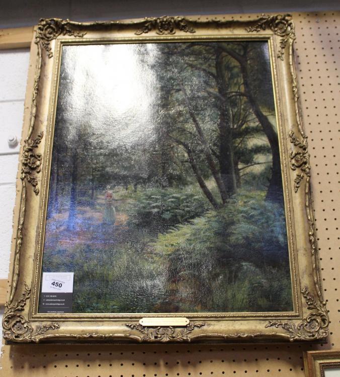 Lot 450 of 787: FREDERICK CLIVE NEWCOME (1847-1894); oil, 'Theodosia in the Meanwood Valley, Leeds' with metal plaque to the frame inscribed 'Theodosia in the Meanwood Valley, Leeds, John Atkinson Grimshaw 1836-1893, painted c1856-1861', labels verso, 52 x 43cm, framed.