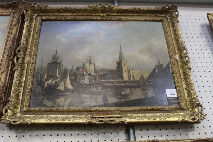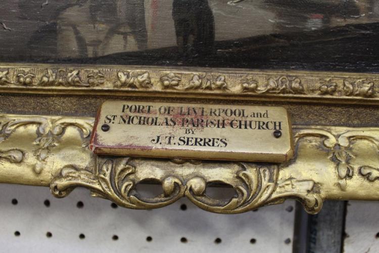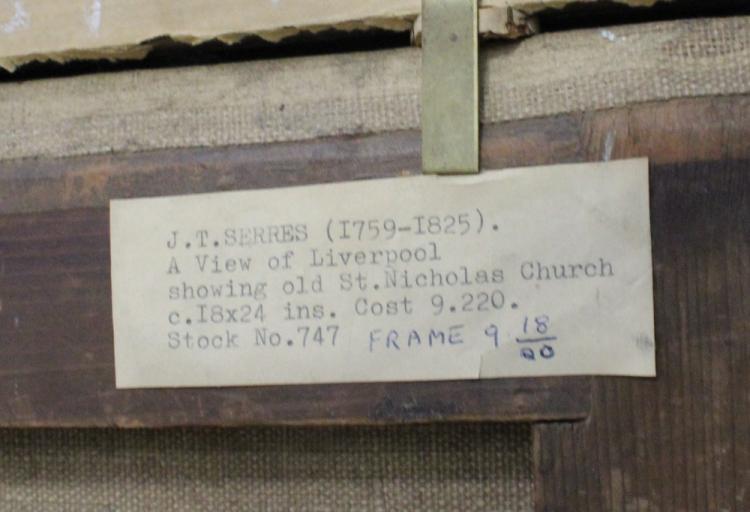 Lot 456 of 787: J T SERRES (1759-1825); oil 'Port of Liverpool and St Nicholas Parish Church' with label verso with description and stock number 747, signed lower right, 45 x 62cm, framed.