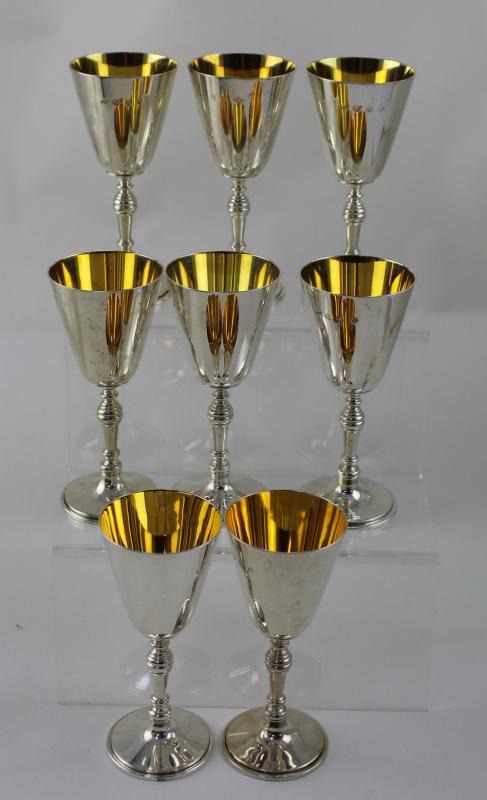 Lot 634 of 787: A cased set of eight silver goblets of trumpet form with gilt interiors, on baluster stems, Boodle & Dunthorne, London 1973, approx 43ozt (8).