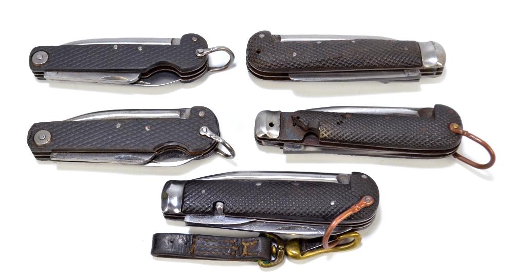 Lot 12 of 545: Five military clasp knives with moulded checkered pattern bodies with single blade, tin opener and marlin spike, including 'Scotia' example by J Mcclory, Harrison Bros and Howson, and JU James & Sons of Sheffield examples, the largest body length 12.5cm (some af) (5).