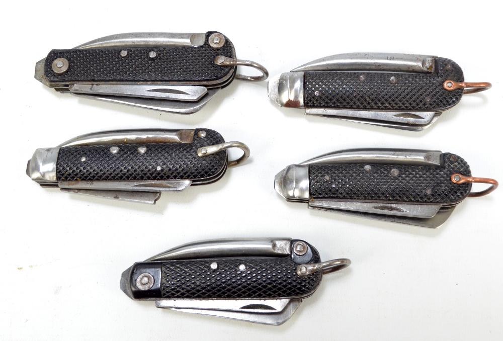 Lot 22 of 545: Five military checkered black bodied clasp knives, each with hinged spike, twin blades and ring loop attachments, length of each approx 9.5cm (5).