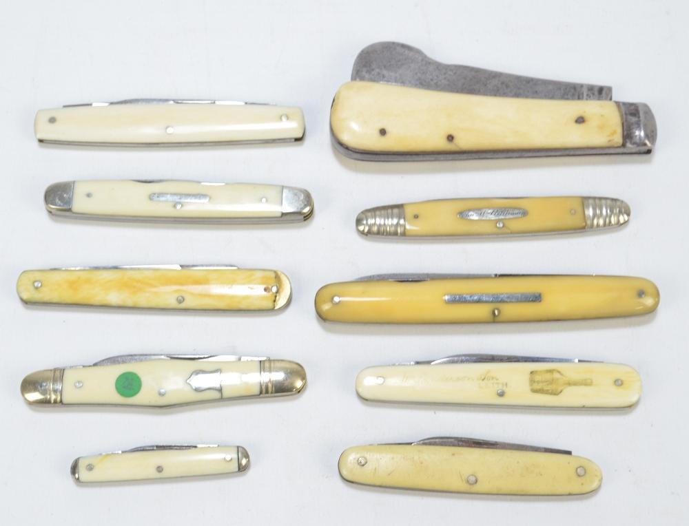 Lot 58 of 545: A collection of ten various ivory, antler and resin bodied pen knives including double bladed examples by G Ibberson & Co, T Renshaw & Son and Turnbridge Wells, a single bladed examples by John Watt and a triple bladed example by Abram Brooksbank of Sheffield, length of body 8cm (some af) (10).