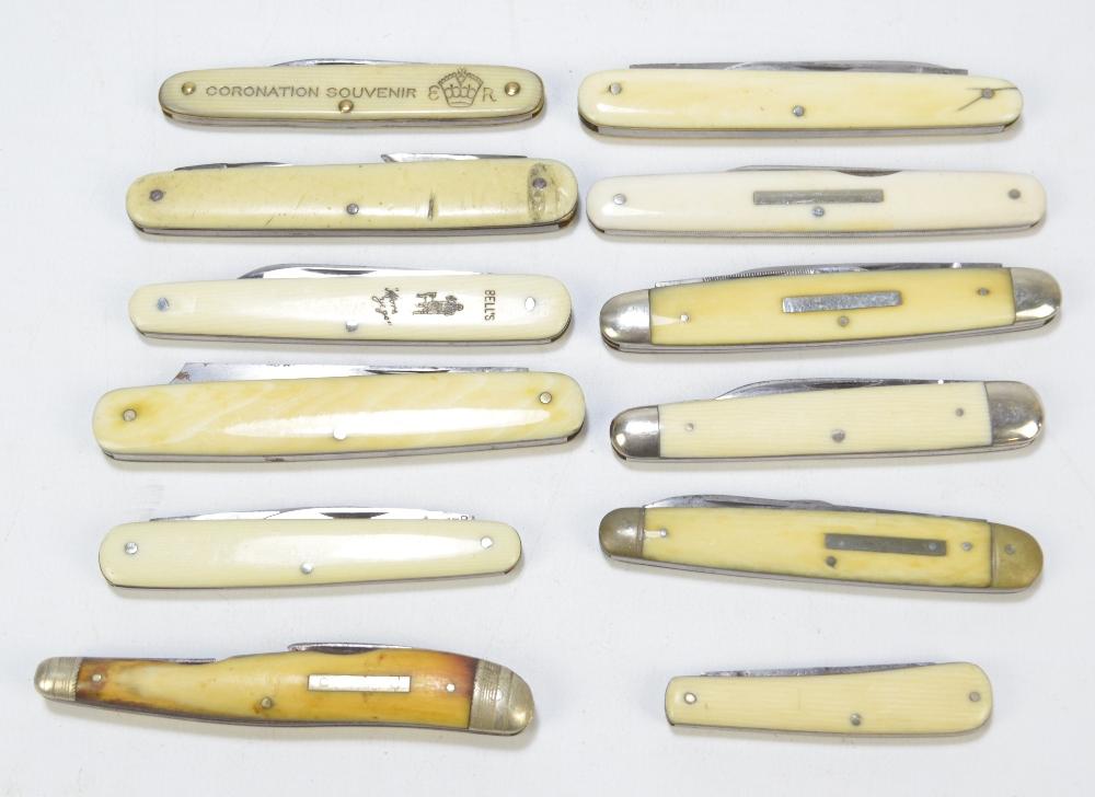 Lot 59 of 545: A collection of twelve ivory, antler and ivorine predominantly double bladed pen knives including examples by J Ibberson, blade inscribed 'Bell's Perth Whisky', George Wostenholm, Mappin & Webb and 'Owltic' by Ibbotson, length of body 7.5cm (12).