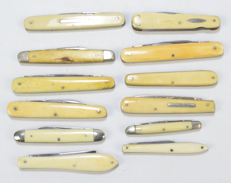Lot 61 of 545: A collection of various ivory, ivorine and antler bodied pen knives including double bladed examples by Southern & Richardson, Turner and G Ibberson, inscribed 'Callender Cables', length of body 8.5cm, a corn knife by Harrison Bros and Howson, and a further single bladed scalpel by Settle of Chester (12).