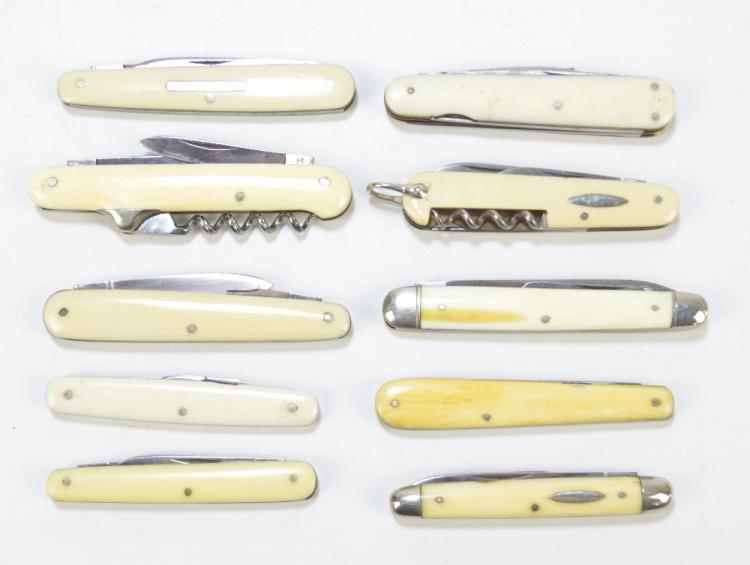 Lot 62 of 545: A collection of ten various ivory, ivorine and antler bodied pen knives including double bladed examples by Abram Brookbank, Jonathan Crooks, and Hale Bros of Sheffield, length of body 8.5cm, a triple bladed example by H Fisher and a further example with a corkscrew by Rodgers, length of body 9cm (10).