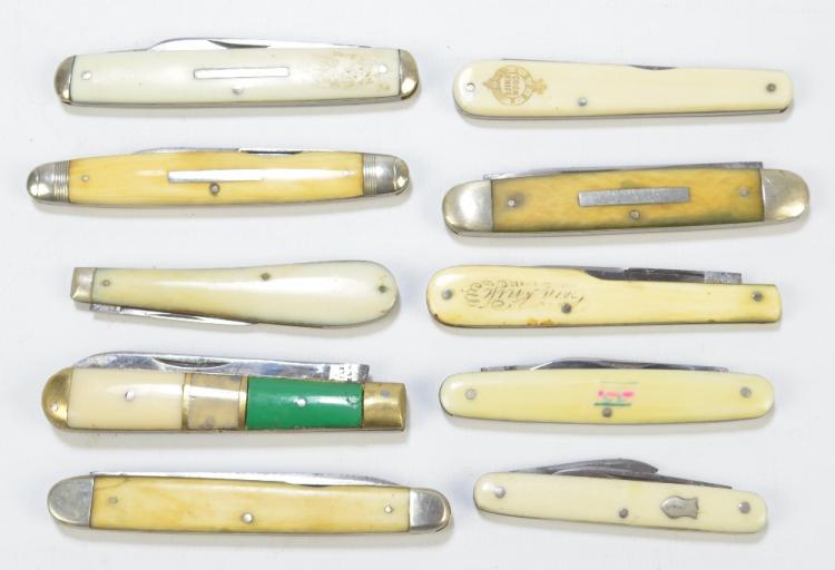 Lot 63 of 545: A collection of ten various ivory, ivorine and resin bodied pen knives including double bladed examples by Gee & Holmes, Needham Bros, and Abram Brookbank of Sheffield, and two single bladed corn knives including one by Wood of Manchester, length of body 8cm.