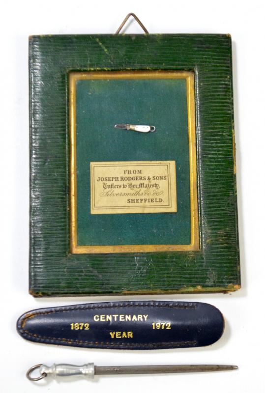 Lot 64 of 545: A miniature mother of pearl and stainless steel penknife, in leather frame with label inscribed 'From Joseph Rodgers & Sons Cutlers to Her Majesty, Silversmiths Co Ltd, Sheffield', length 2cm and a miniature steel in leather pouch, length 9cm (2).