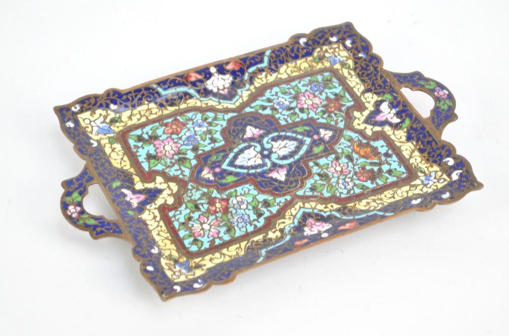 Lot 253 of 545: A late 19th century French brass twin handled tray/pin dish decorated with champlevй enamels in foliate scroll and floral motif, the base stamped 'ME', raised on four feet, length 18.5cm.
