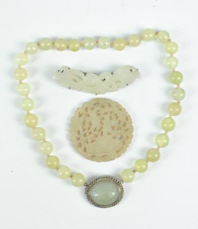 Lot 522 of 545: A Chinese pierced mutton fat jade brooch with white metal mounts, length 7.8cm, a bead necklace with oval clasp and a circular pierced plaque, diameter 5.6cm (3).