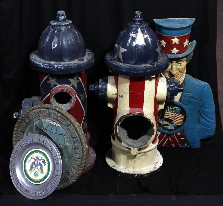 Lot 205 of 288: AMERICANA; two painted cast iron fire hydrants, both stamped 'CHATTA NOOGA TENN' to top and 'MUELLER 5 1/4' and 'CHATTA NOOGA 1967' to bodies, height approx 73cm, also a reproduction 'Uncle Sam', and 'MSTS' plaque and 'Great Seal' plate (5).