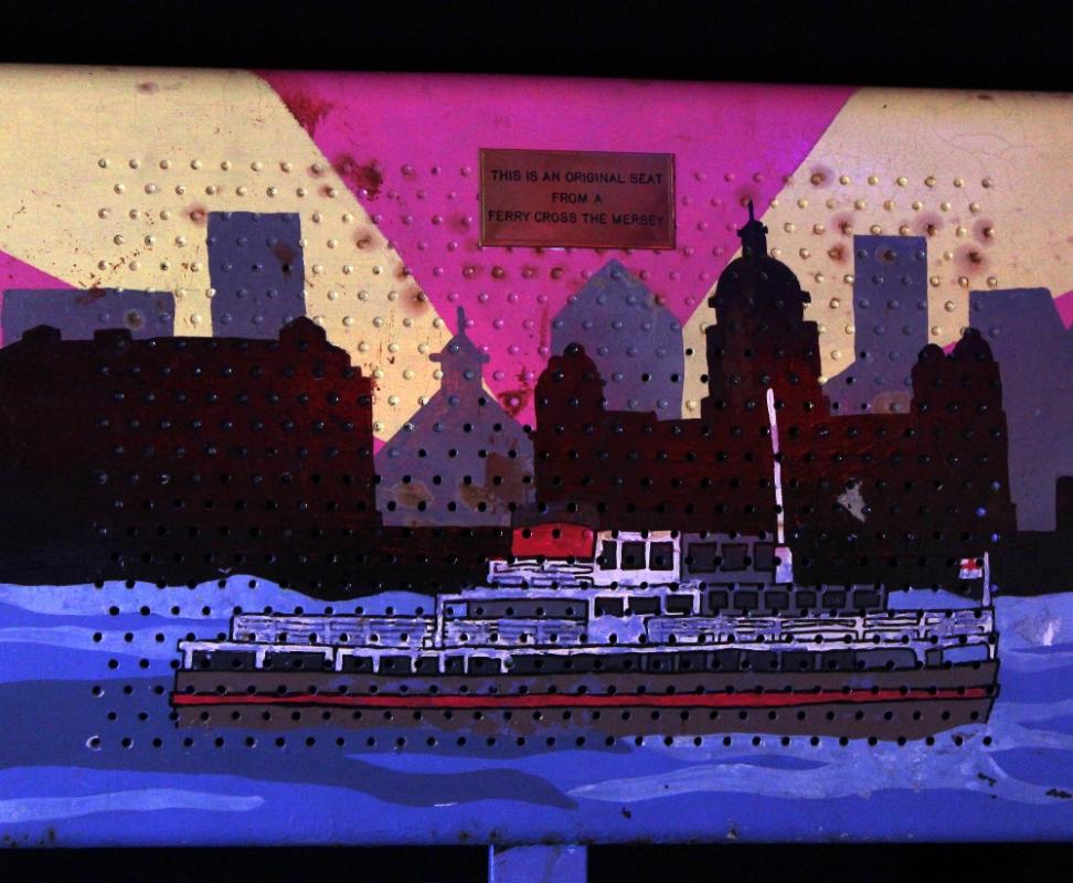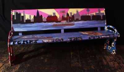 Lot 209 of 288: An original iron seat from a Mersey ferry, later painted by Gareth Arrowsmith with stylised Liverpool and Mersey scene, width approx 183cm.