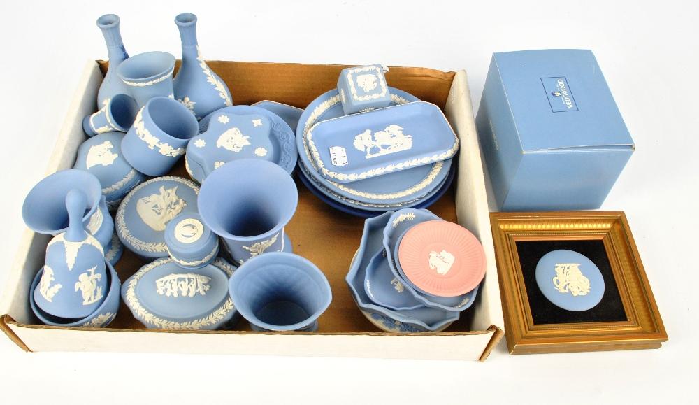 Lot 728 of 2338: A collection of Wedgwood predominantly blue jasperware to include pin dishes, trinket boxes, vases, a framed roundel, and a boxed timepiece.