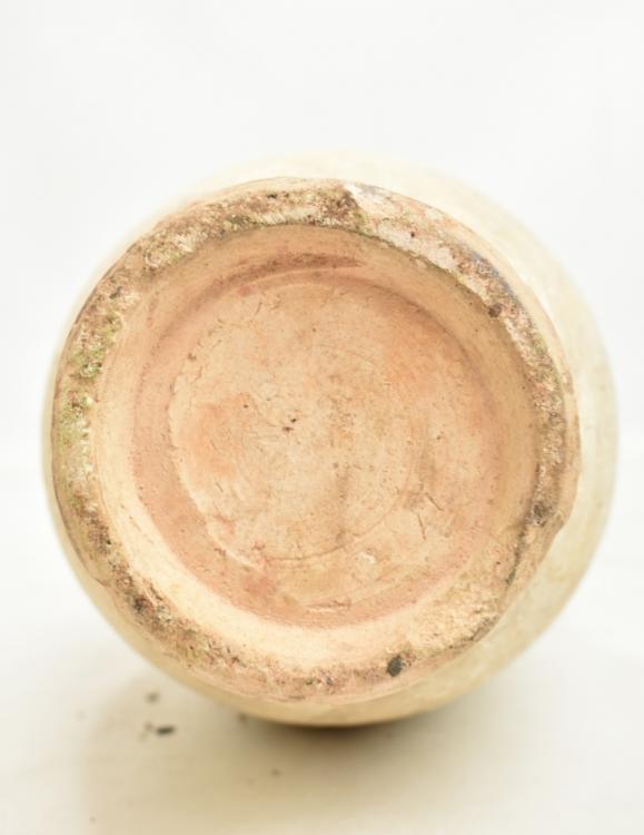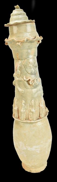 Lot 5 of 744: Three Chinese Qingbai (or Yingqing) stoneware funerary urns, all with applied moulded detail featuring figures and chilongs, the two taller Song/Yuan dynasty, the smaller Tang dynasty, one with lid, height of tallest 66cm (3).