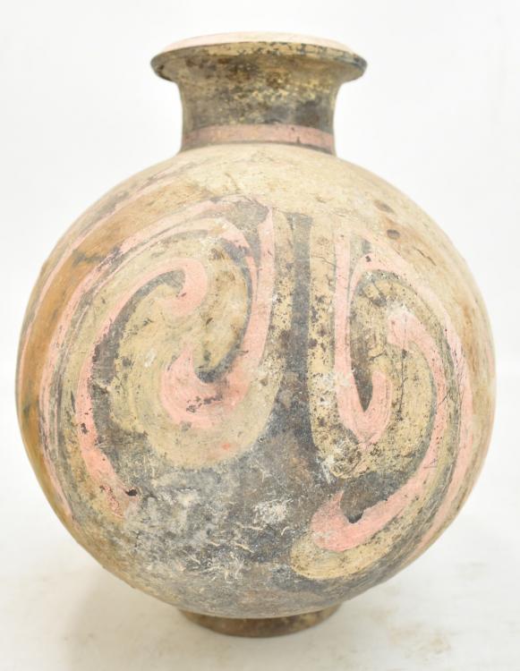 Lot 7 of 744: A Chinese Han dynasty earthenware cocoon vase with simple painted stylised detail on circular foot, 24.5 x 27cm.