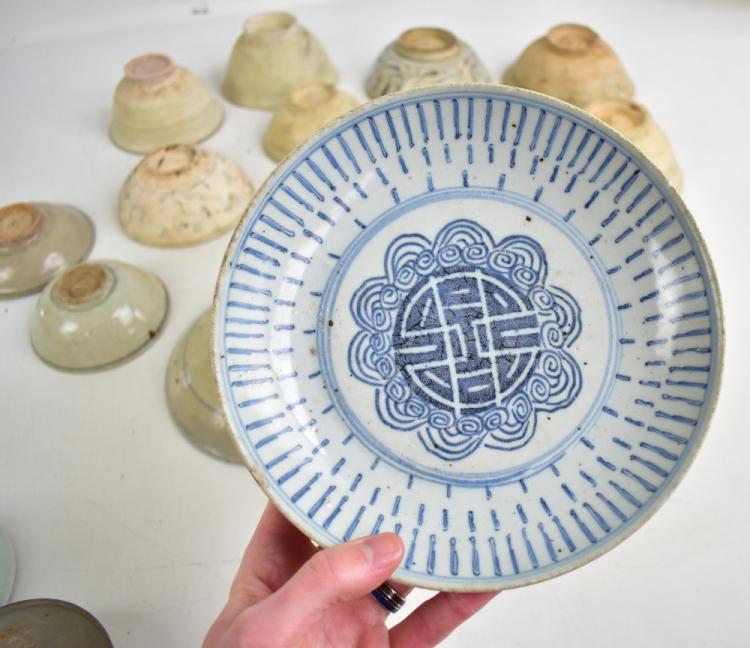 Lot 12 of 744: A group of thirteen Chinese late Ming provincial earthenware bowls, some with simple painted decoration, diameter of largest approx 20cm (some af).