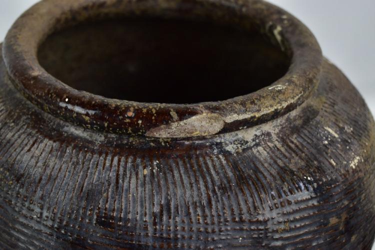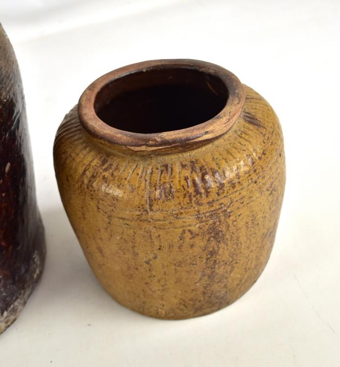 Lot 18 of 744: A large Chinese Song dynasty vessel with upper bands of simple incised decoration, height 34cm, and two further Chinese provincial vessels, heights 19cm and 25.5cm (3).