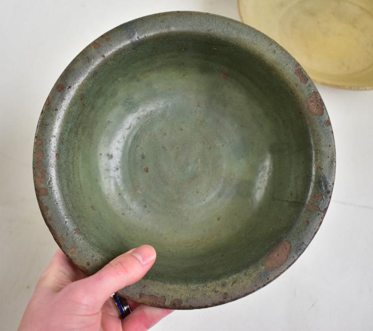Lot 19 of 744: A group of circa 14th-15th century Sawankhalok (Thailand) celadon ware including tea bowl, diameter 11cm (af), further celadon glazed bowls and four provincial earthenware jars (9).