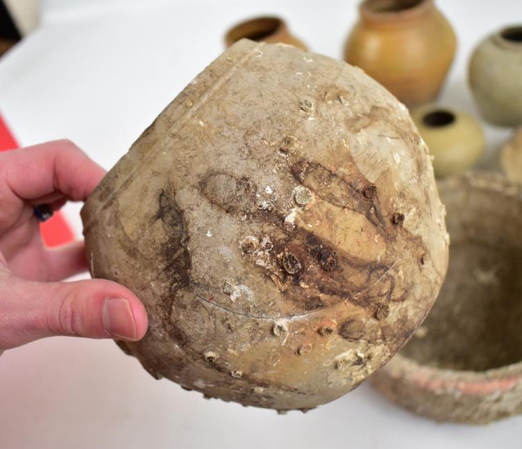 Lot 20 of 744: A group of Chinese late Ming provincial earthenware including a teapot, jars and large bowl, some with marine encrustation.