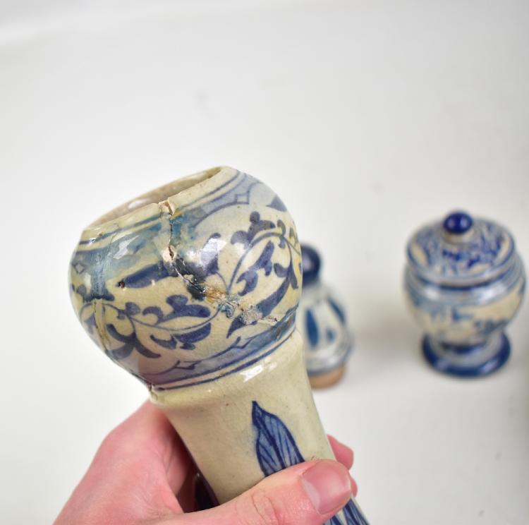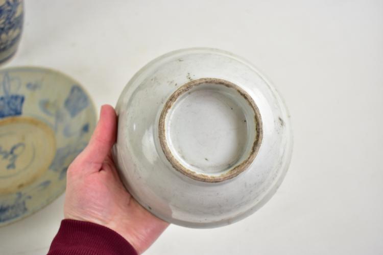 Lot 22 of 744: A Chinese Song Dynasty pale celadon glazed footed bowl, diameter 17cm, a provincial shallow bowl, diameter 28.5cm, a large blue and white ewer, height 49cm, and a small jar and cover (4).