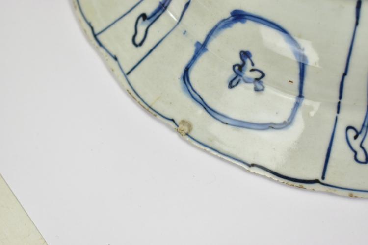 Lot 23 of 744: A Chinese late Ming kraak porcelain bowl painted in underglaze blue with typical panel and foliate motif, further similar detail to reverse, diameter 28.8cm.
