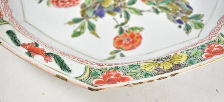 Lot 28 of 744: An 18th century Chinese porcelain Famille Verte octagonal plate, painted in enamels with floral detail inside a fish and floral border, bears double ring mark to base, diameter 25cm.