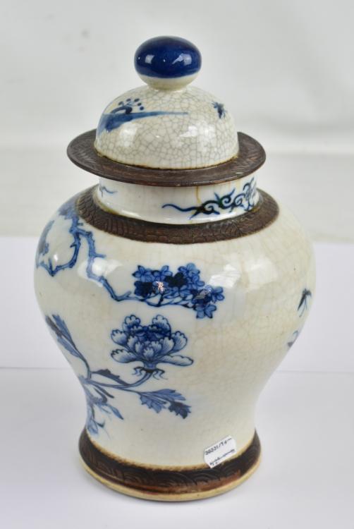 Lot 34 of 744: A late 19th century Chinese porcelain lidded baluster vase painted in underglaze blue with birds amongst blossoming branches, with typical earthenware bands to lid, rim and body, apocryphal Chenghua four character mark to base, height including lid 31.5cm (af).