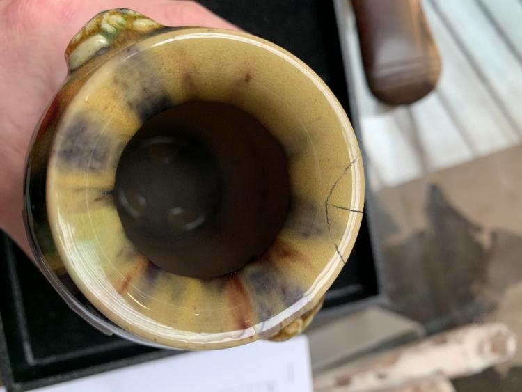 Lot 35 of 744: A pair of 19th century Chinese mottled tortoise shell glazed vases with applied masks beneath the everted rims, unmarked, height 17.5cm (2).