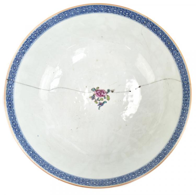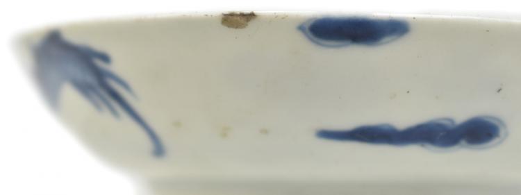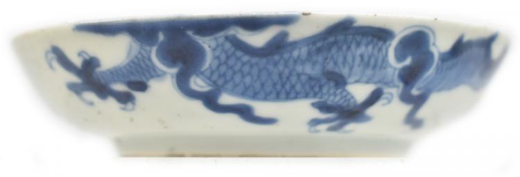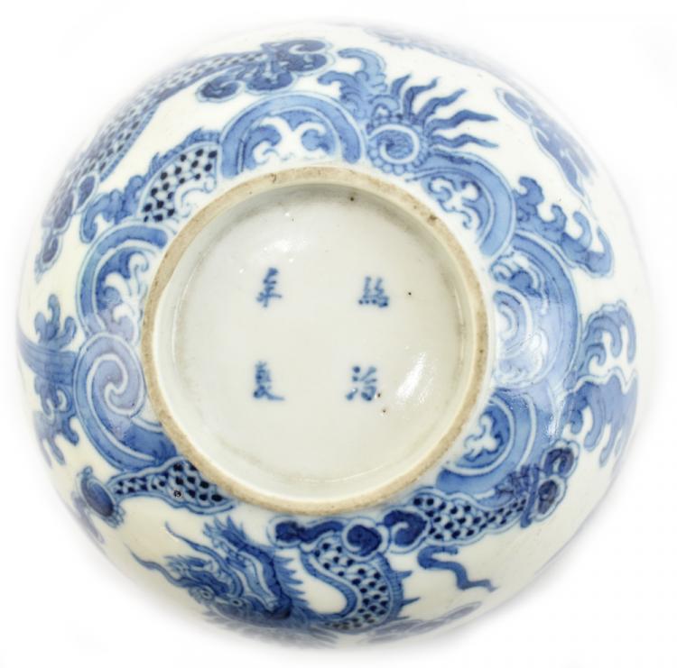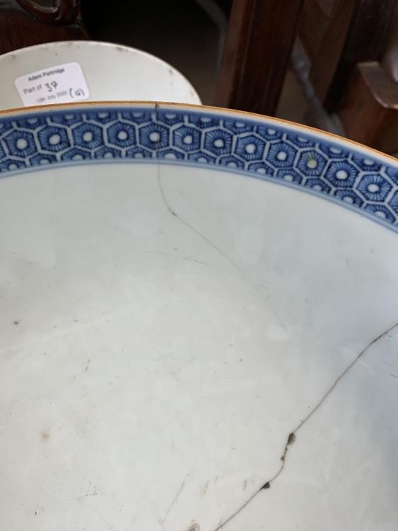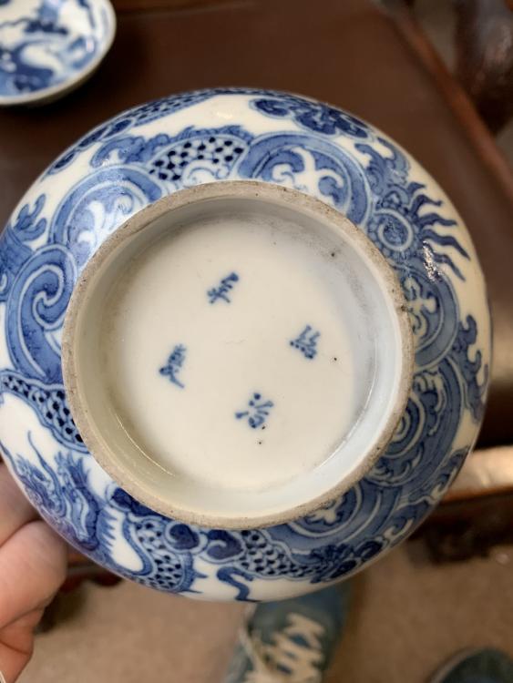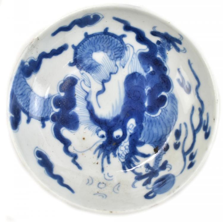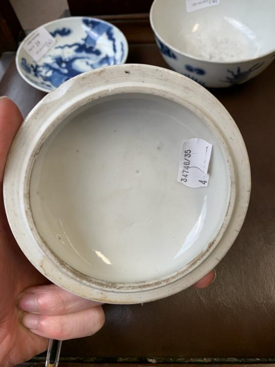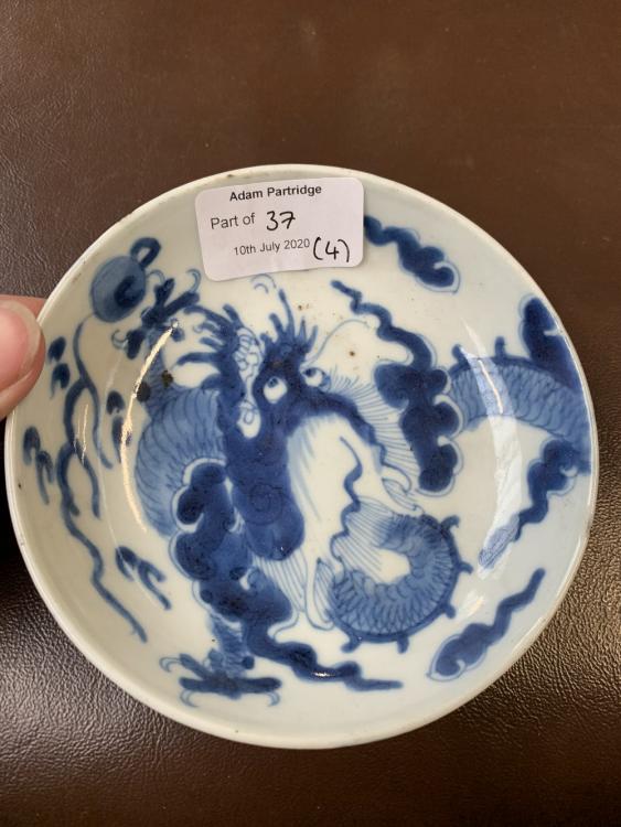 Lot 37 of 744: A 19th century Chinese porcelain bowl painted in underglaze blue with two dragons chasing the pearl of wisdom, four character mark to base, diameter 13.5cm, a further large bowl (af), a 19th century saucer and a Famille Rose lid (4).