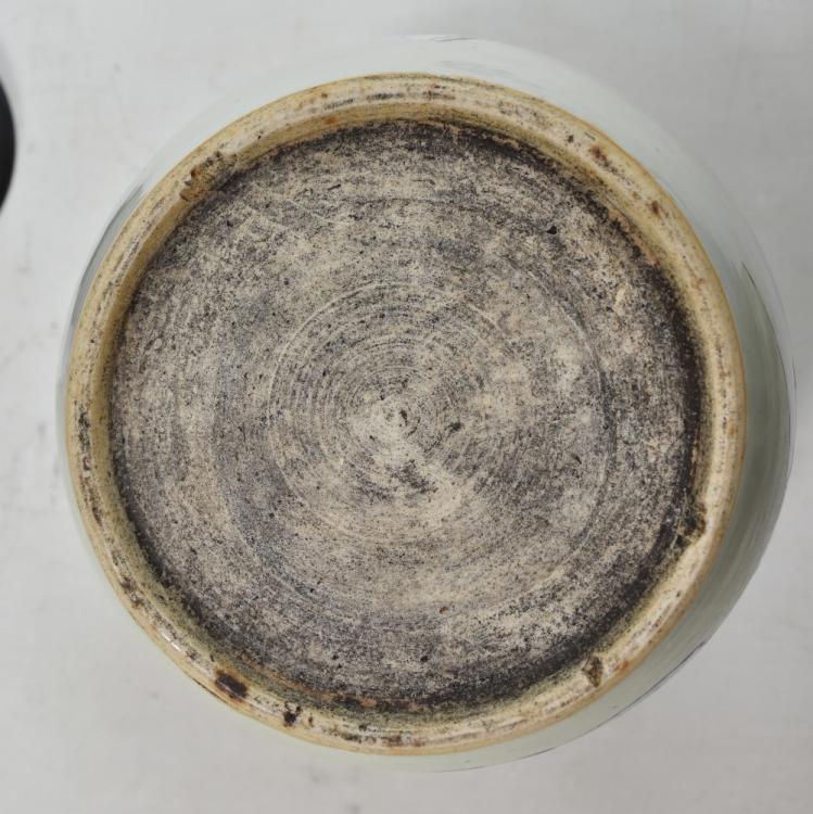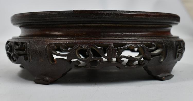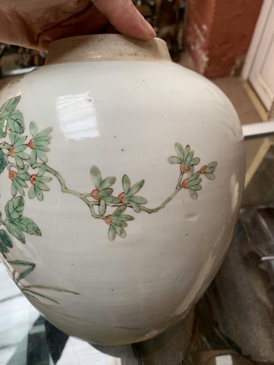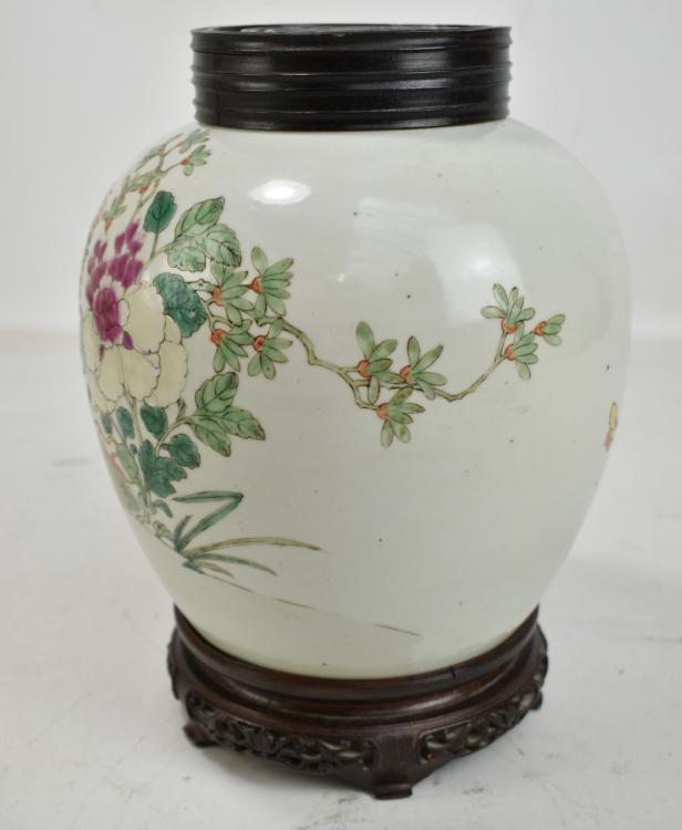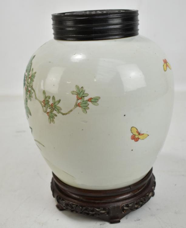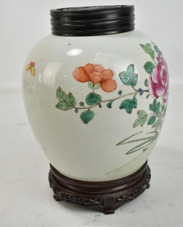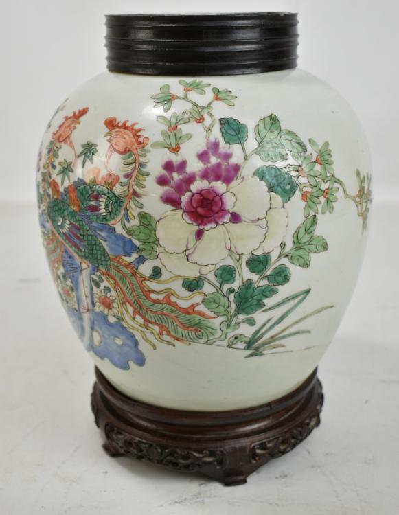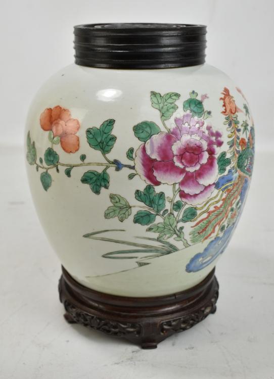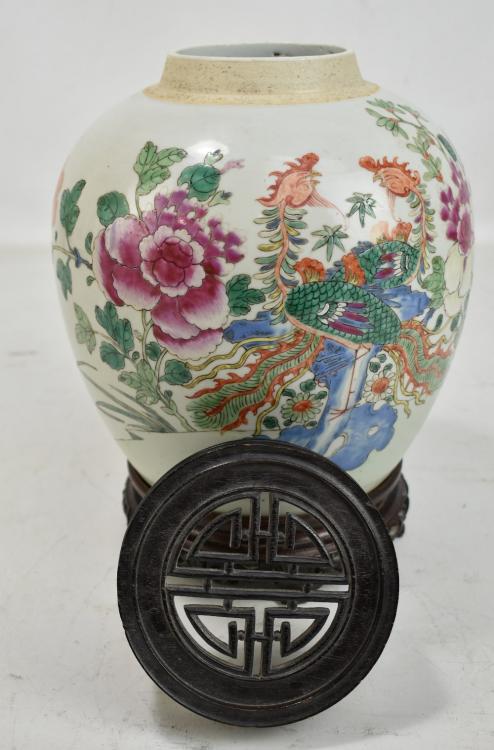 Lot 39 of 744: A late 19th century Chinese porcelain ginger jar painted in enamels with two phoenix amongst flowers on celadon ground, unmarked, with associated hardwood lid featuring pierced shou character on carved hardwood stand, total 29 x 20cm, height of jar only 22.5cm.