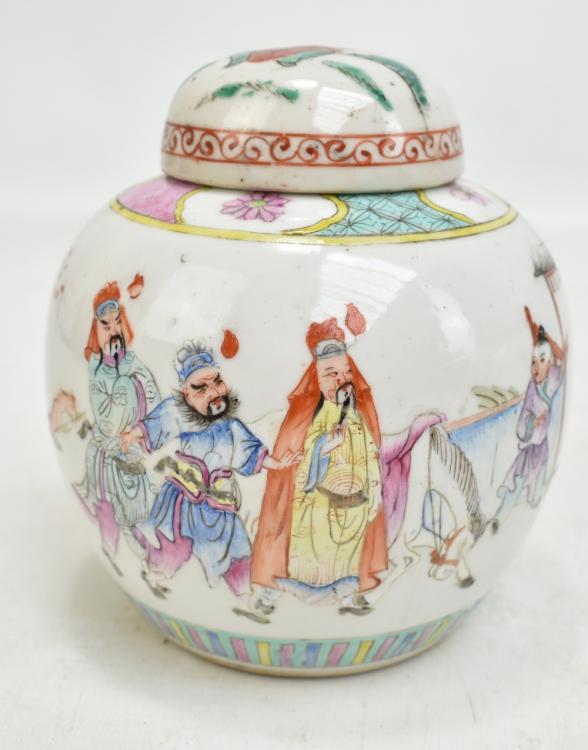 Lot 50 of 744: A 20th century Chinese lidded ovoid jar with enamelled floral decoration featuring stylised shou characters, apocryphal four character mark to base, approx 21 x 21cm, and five enamelled decorated ginger jars, one with lid (one af) (6).