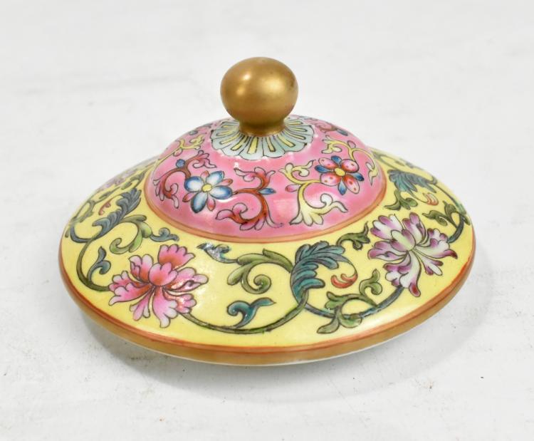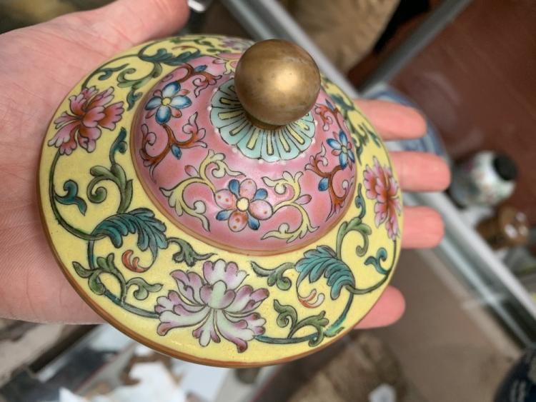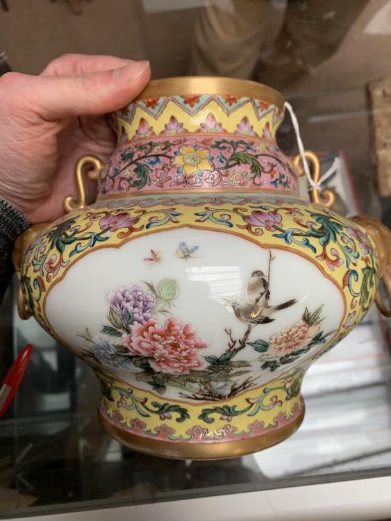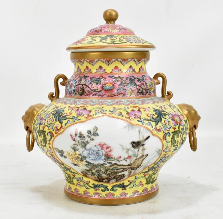 Lot 51 of 744: A 20th century Chinese lidded porcelain vase/vessel with twin gilt mask and loop handles featuring twin panels with birds amongst flowers against bands of enamelled floral sprays on pink, light blue and yellow grounds, apocryphal six character Qianlong mark in underglaze blue to base, approx 23 x 22cm.