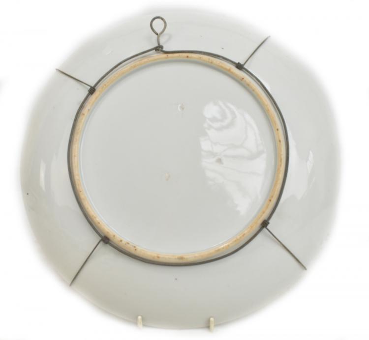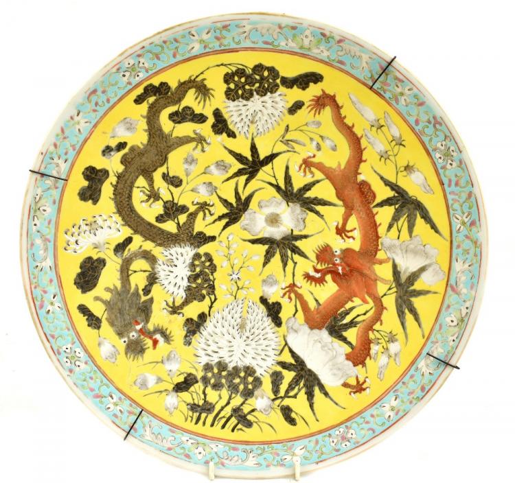 Lot 54 of 744: A Chinese late 19th/early 20th century Famille Jaune charger decorated with two four claw dragons amongst floral sprays on a yellow ground with floral decorated border on turquoise ground, unmarked, diameter 41.2cm, and a slightly smaller charger featuring two quails perched on branch amongst blossoming peonies on blue ground within floral decorated yellow ground border, also unmarked, diameter 37.4cm (2).