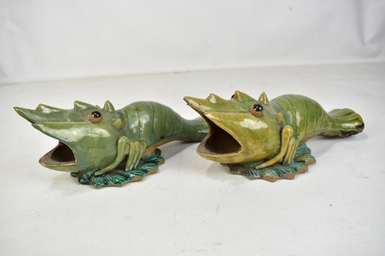Lot 56 of 744: An unusual pair of Chinese celadon glazed wall pockets modelled as crayfish, unmarked, length 29cm (2).