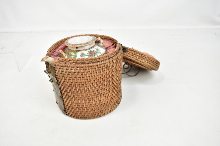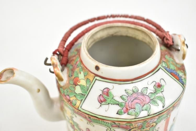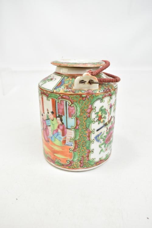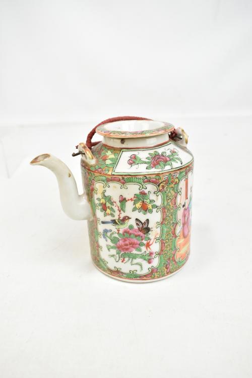 Lot 59 of 744: A 20th century Chinese Canton teapot painted with figures and birds in panels, height 12cm, fitted in wicker case.