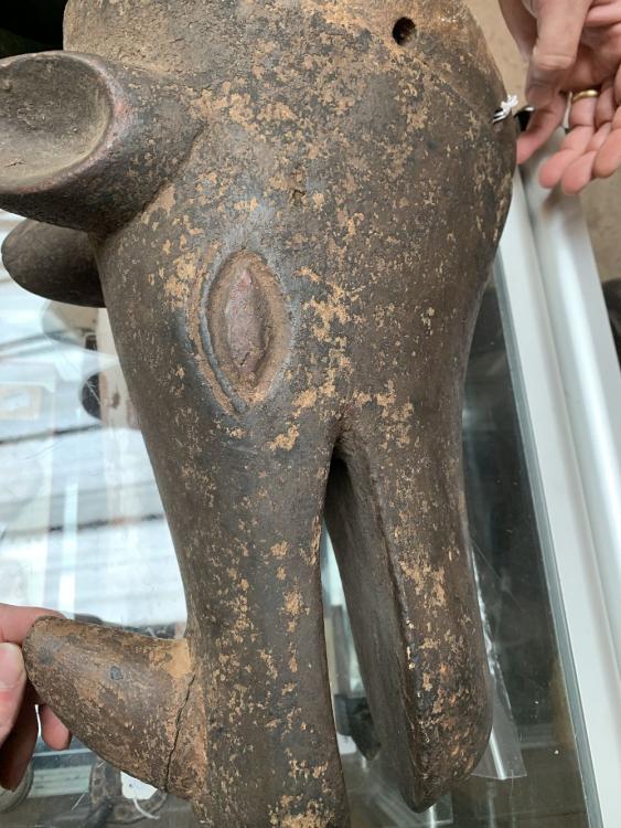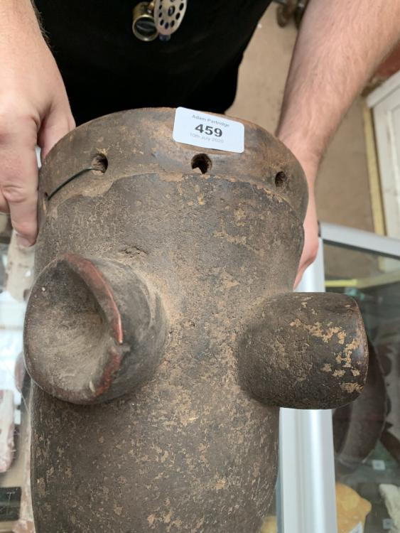 Lot 459 of 744: An African tribal mask in the form of a rhinoceros head, with pierced section to the collar, height 38cm.