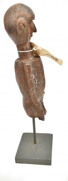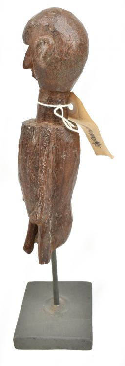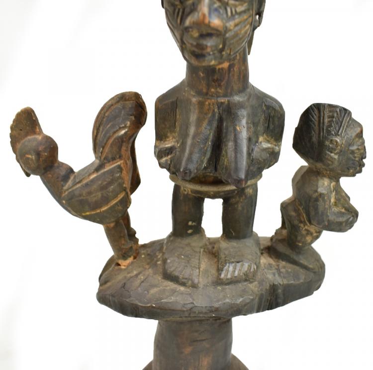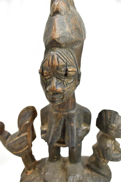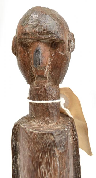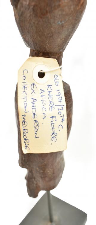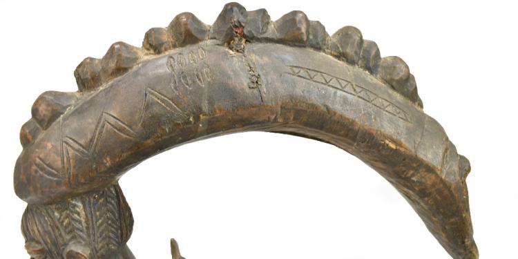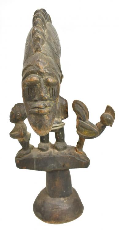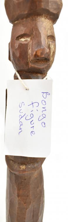Lot 463 of 744: An early 20th century African tribal Kwere figure with lower portion missing, a Sudanese Bongo figure and a masquerade headdress, height of tallest 45cm (3).