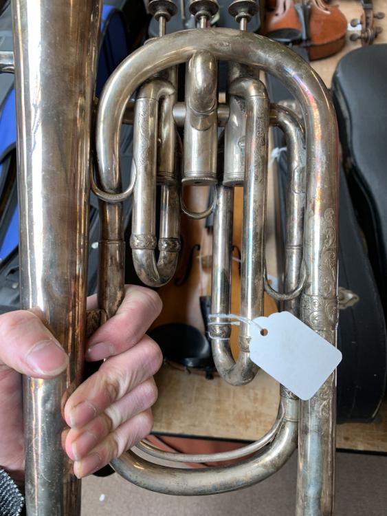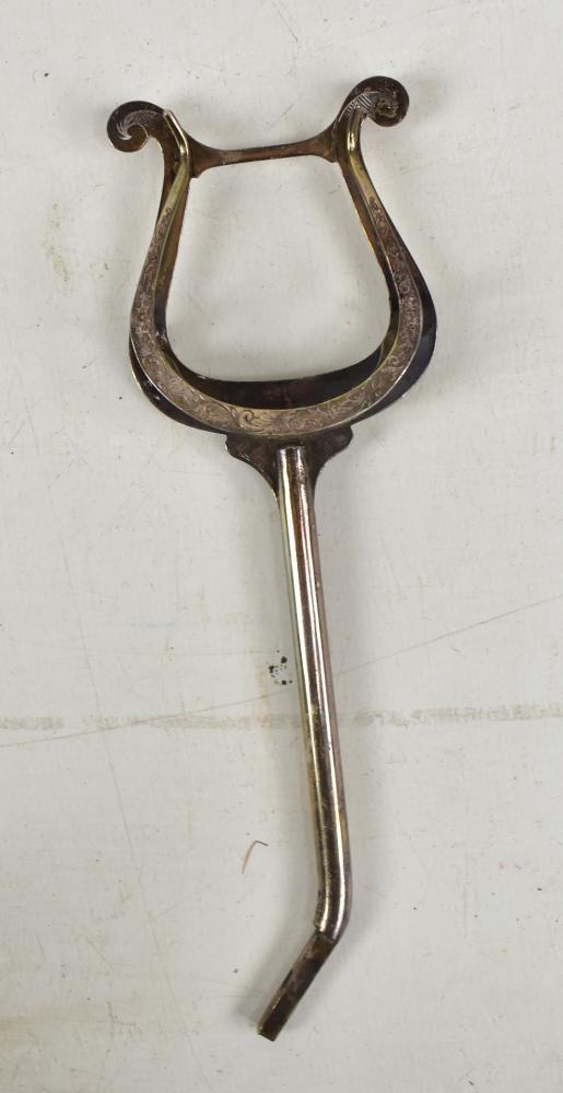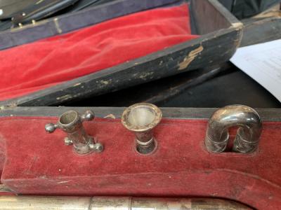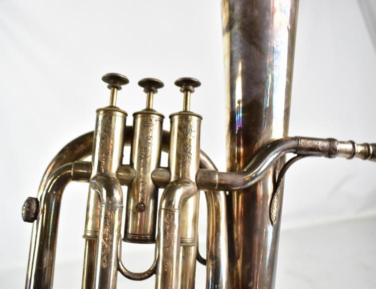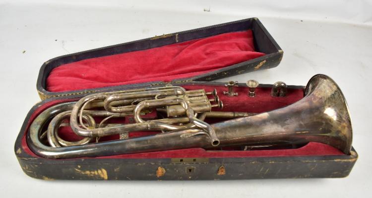 Lot 583 of 744: A silver plated horn with engraved decoration, marked 'H Distin, Cranbourn Strt, Leicester Sq, London', cased.