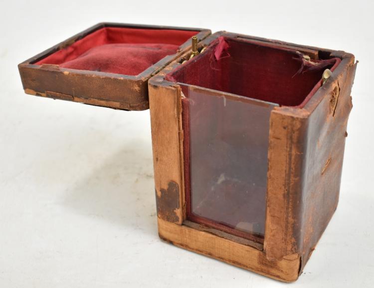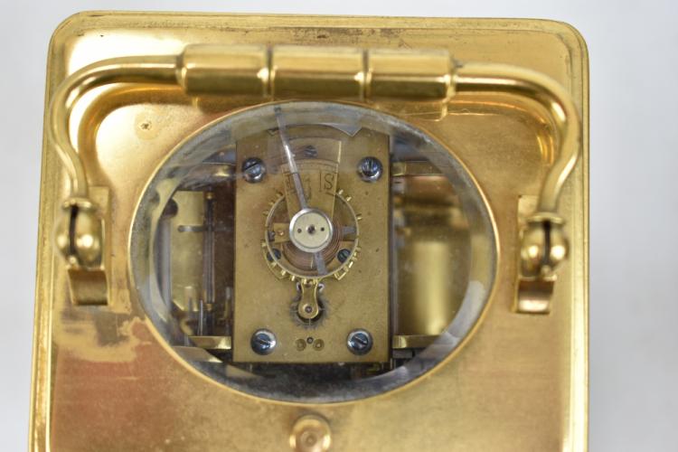 Lot 599 of 744: A late 19th century French brass cased repeating carriage clock, the enamel dial set with Roman numerals, with twin drum movement and alarm function, the back plate with French patent mark, in original leather bound carrying case with glazed panel and key, height excluding swing handle 12.4cm.