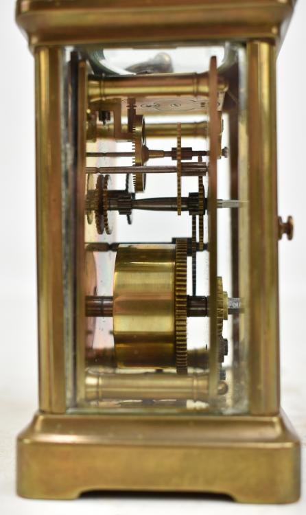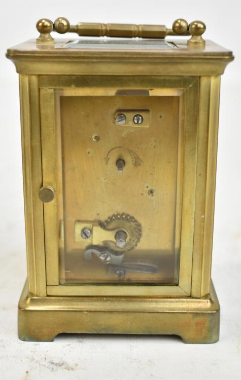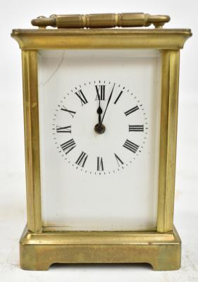 Lot 603 of 744: Two early 20th century brass cased carriage clocks, the circular enamel dials set with Roman numerals, both with single drum movements, one back plate stamped 'A.C.C.L.', height of each excluding swing handle 11cm (both lacking keys) (2).