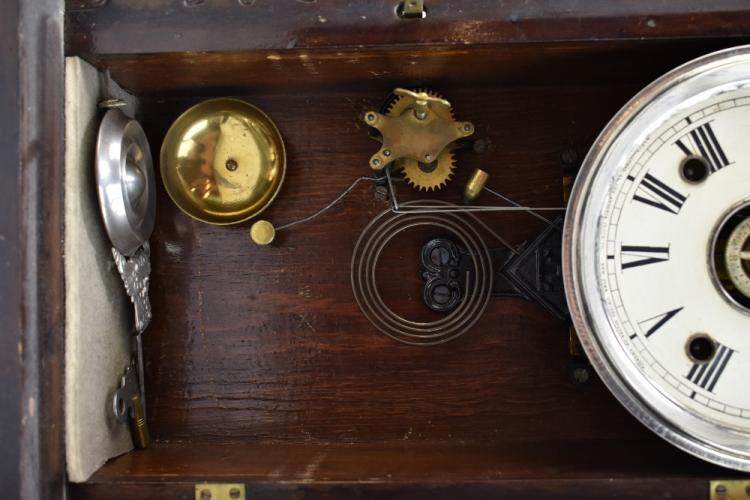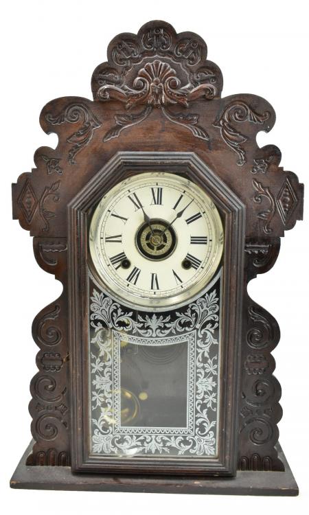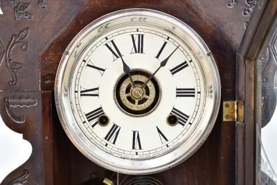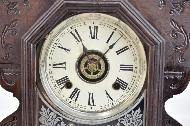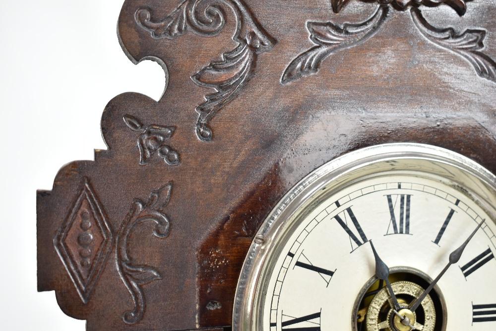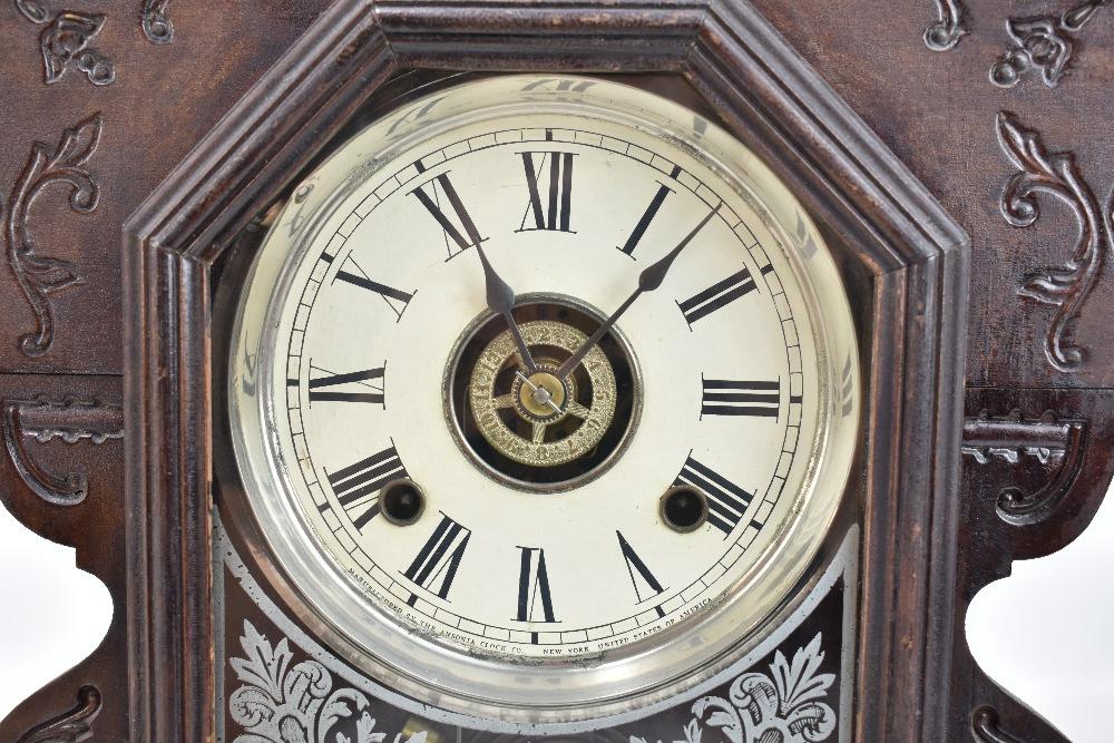 Lot 636 of 744: ANSONIA CLOCK COMPANY OF NEW YORK USA; a late 19th century American gingerbread clock, the case with carved detail throughout, the circular dial set with Roman numerals, Arabic numerals to centre, behind glazed door with printed floral detail to lower section, with bell and gong striking mechanism, with key and pendulum, 52 x 33cm.