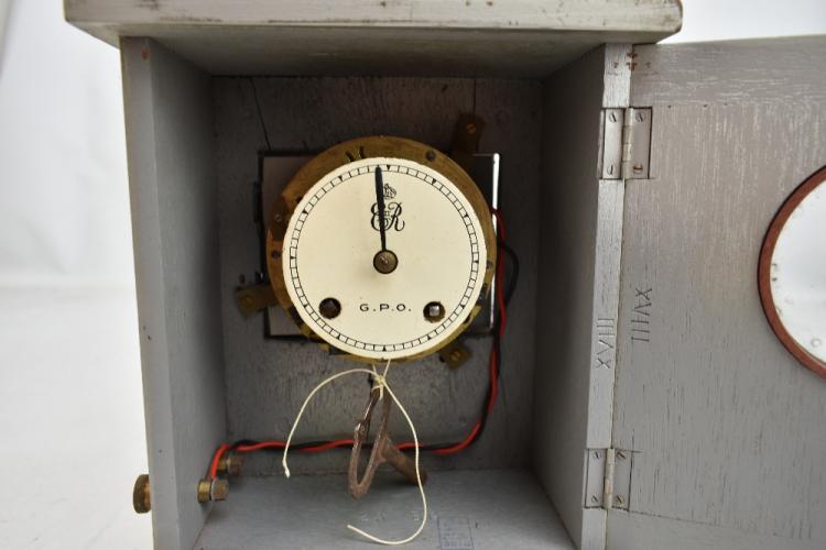 Lot 30 of 1228: A mid-20th century ex-Post Office mechanical time switch, the circular dial with Elizabeth II cipher and inscribed G.P.O., in silver painted mahogany case, 24 x 20 x 11cm.